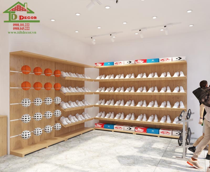 Kệ trưng bày cũng được thiết kế một cách tối giản sang trọng phù hợp với bố cục cửa shop thể thao nam.
