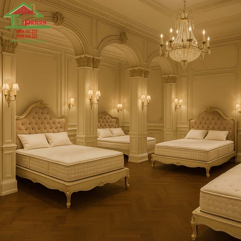 Sử dụng chi tiết nội thất cầu kỳ, vật liệu cao cấp như nhung, gỗ tự nhiên và màu sắc trầm ấm. Tính đối xứng và sự sang trọng mang đến cảm giác đẳng cấp, phù hợp với phân khúc nệm cao cấp. Phong cách này tạo nên không gian uy nghi và ấn tượng mạnh.