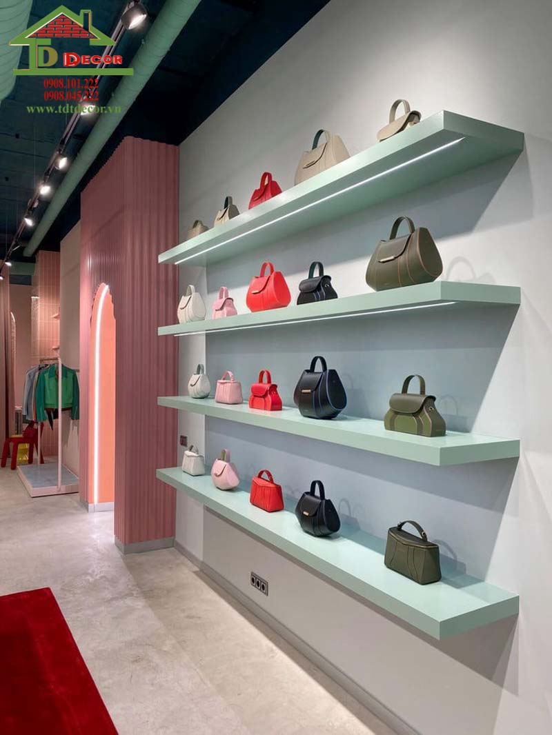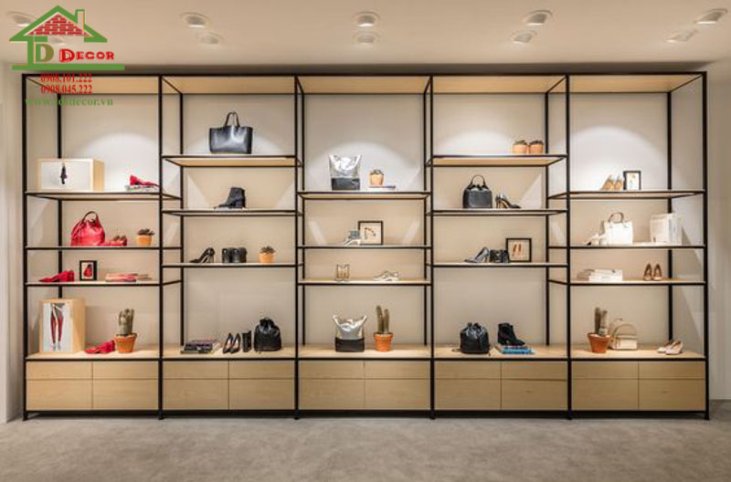 Mẫu thiết kế túi túi xách có các đợt kệ nghiêng trưng bày giày dép
